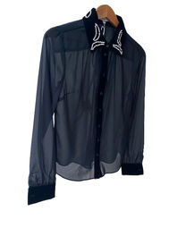 Een elegante zwarte blouse met een verfijnde en vrouwelijke uitstraling.