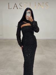 Luxe zwarte galajurk volledig bezet met rijke pailletten. Deze elegante jurk combineert glamour met een krachtige, vrouwelijke uitstraling en is perfect voor gala’s, exclusieve feesten en bijzondere avonden.