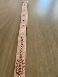 Een verfijnde leren damesriem in een zachte, lichte tint met roségoudkleurige gesp en subtiele studs – stijlvol, vrouwelijk en tijdloos.